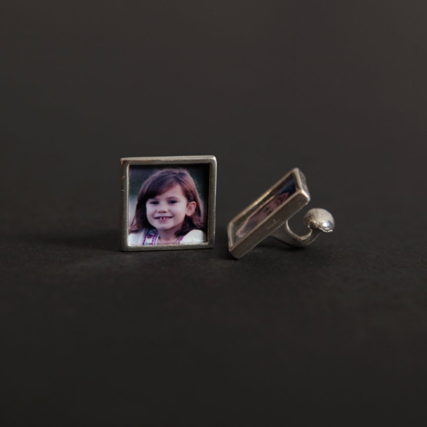 sterling silver 1/2" square one-sided cufflinks are waterproof. they can be made with the same photo on both cufflinks or a different photo on each.